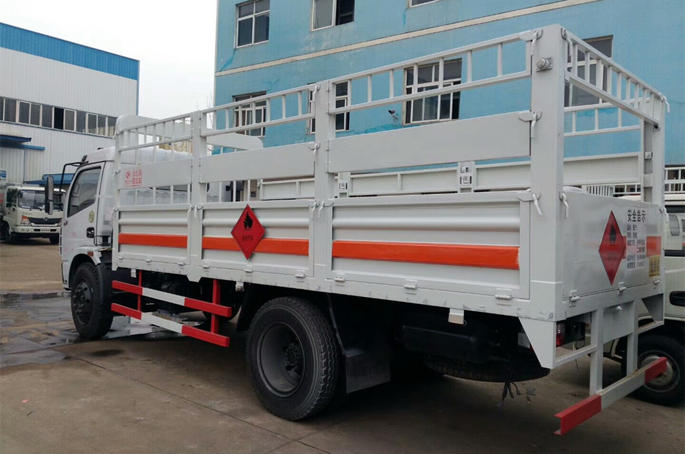 該車適用于運輸危險品。用于運輸具有**容器(瓶)包裝的易燃氣體(類項號:2.1):液化石油氣,壓縮甲烷或甲烷含量高的壓縮天然氣,乙炔,乙烷,丁烷,丙烯,丁烯,二甲醚,壓縮氧;用于運輸具有**容器(瓶)包裝的非易燃無毒氣體(類項號:2.2):二氧化碳,壓縮氧(氮,空氣,氦,氬,氖)。防護材料:Q23**碳鋼,連接方式:左右側面及后部防護均采用焊接連接,后部防護斷面尺(mm):**×50, 后部防護離地高度(mm):500。僅采用底盤子午線輪胎和帶ABS的底盤,該車前輪安裝盤式制動器,前置排氣管,裝配限速裝置,限速80km/h。安裝帶有衛星定位功能的行駛記錄儀。ABS系統生產廠家及型號:襄陽東風隆誠機械有限責任公司,ABS/ASR-24V-4S/4M。隨底盤選裝前面罩,前保險杠,前組合燈具。上裝可選裝無柵欄。后部液壓尾板收起狀態的水平長度是250mm。危險貨物運輸車輛的車輛類型(FL型車輛)。 |