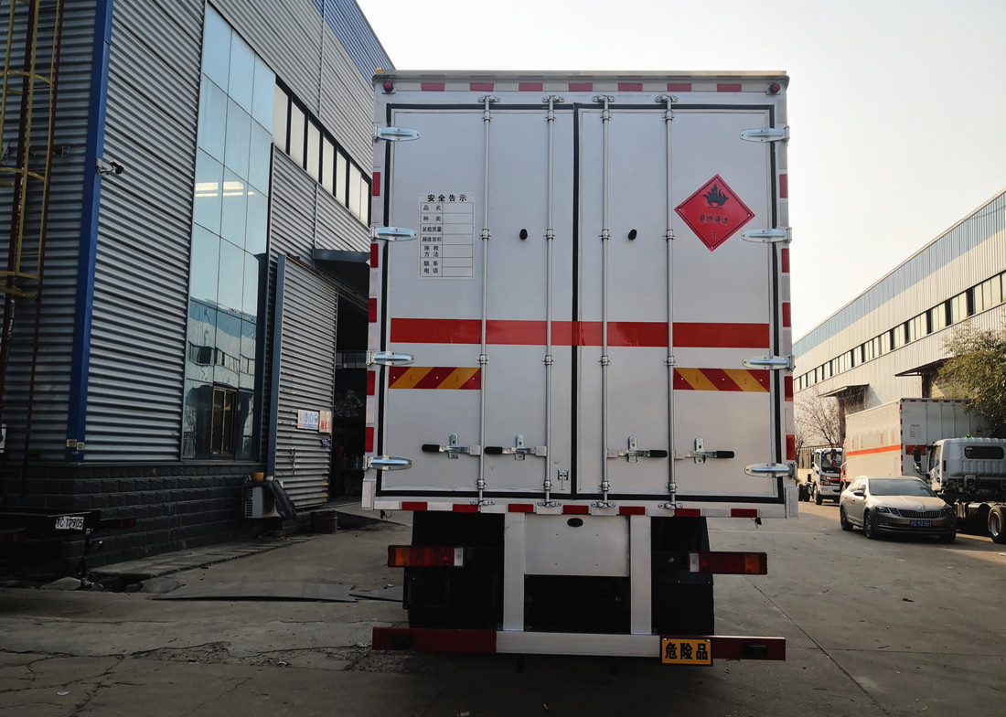 該車為危險品運輸車.該車頂部封閉,不可開啟.隨底盤選裝平頂駕駛室;選裝駕駛室前面罩;高頂駕駛室頂部氣喇叭為選裝件;駕駛室前角擾流板為選裝件,蓄電池及儲氣筒可選裝右置.該車用于運輸具有**容器(瓶)包裝的易燃液體,類項號3.后部安裝液壓尾板,液壓尾板收起水平長度300mm,尾板重量為550kg,側、后防護材料:Q235,連接方式均為焊接連接,后防護截面高120mm,截面寬50mm,下邊緣離地高490mm;后部不安裝尾板時后防護裝置材料:Q235,連接方式為焊接,后防護截面高120mm,截面寬50mm,下邊緣離地高490mm.選裝側開門型式及位置;廂體選裝開百葉窗,選裝后部樣式.僅采用排氣管前置,子午胎,限速裝置,**制動裝置和前盤制動器的底盤;限速80km/h.安裝具有衛星定位功能的行駛記錄儀;ABS型號/生產廠家:ABS 8/東科克諾爾商用車制動系統(十堰)有限公司.發動機型號及油耗值(L/**km)對應關系為: DDi75E350-60/38.1.僅采用1995+4500+1350(mm)軸距.后軸僅采用空氣懸架.轉向輪裝備輪胎爆胎應急防護裝置.選裝ETC車載裝置. |